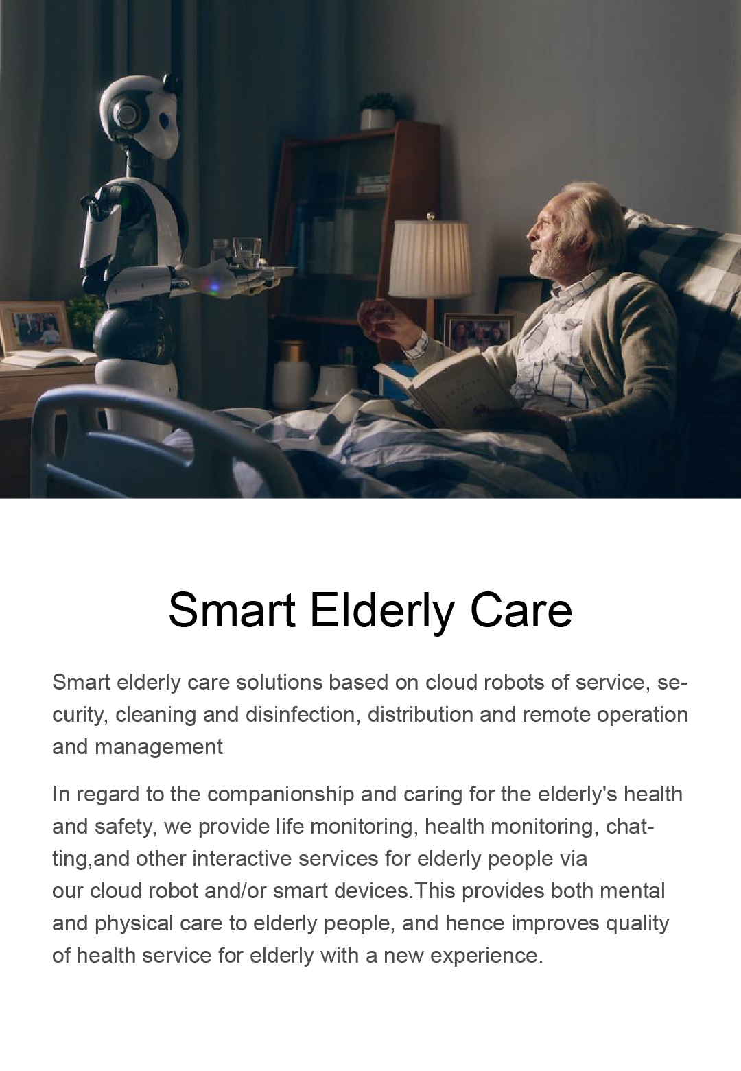 Smart elderly care solutions based on cloud robots of service, security, cleaning and